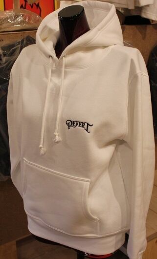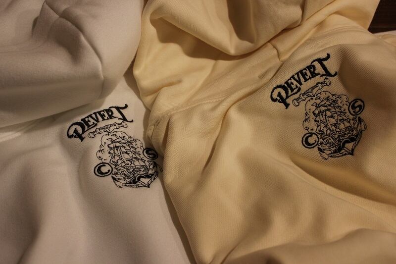 10.0ozの裏パイル地プルオーバーパーカに刺繍でデザインを落とし込みました。フードで見え隠れするトラディショナルシップが遊び心を擽ります。